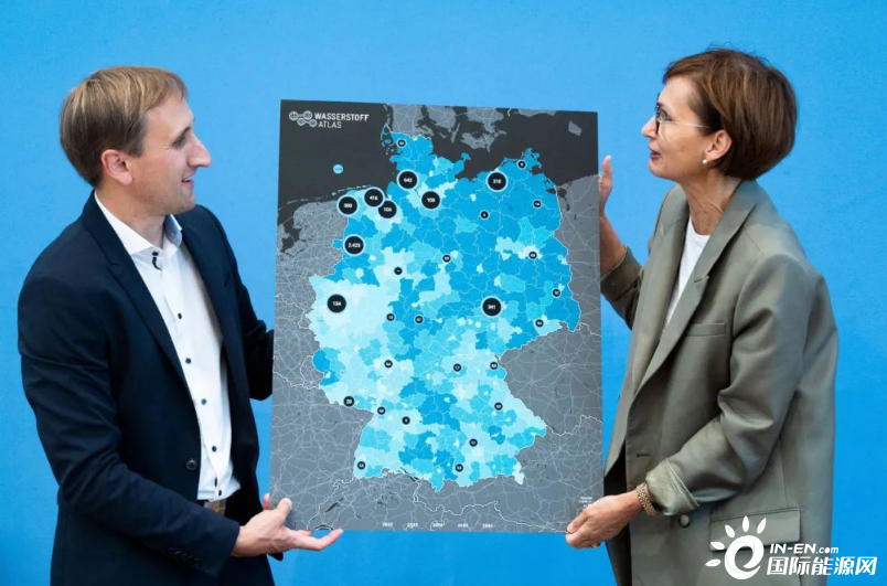 ▲德國聯(lián)邦教育及研究部部長和東巴伐利亞應(yīng)用技術(shù)大學(xué)的一名教授在2022年的新聞發(fā)布會上展示“德國氫能地圖”。這份地圖展示了德國氫能生產(chǎn)商、消費(fèi)者和“綠色氫能價值鏈”網(wǎng)絡(luò)。圖片來源:Christophe Gateau / Alamy