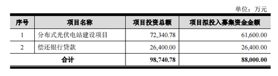 10月24日,芯能科技向不特定對象發(fā)行可轉換公司債券募集說明書。據(jù)披露,本次發(fā)行可轉債預計募集資金總額為人民幣88,000萬元,扣除發(fā)行費用后,將6.16億元用于投入分布式光伏電站建設項目、2.64億元償還銀行貸款。具體項目如下: